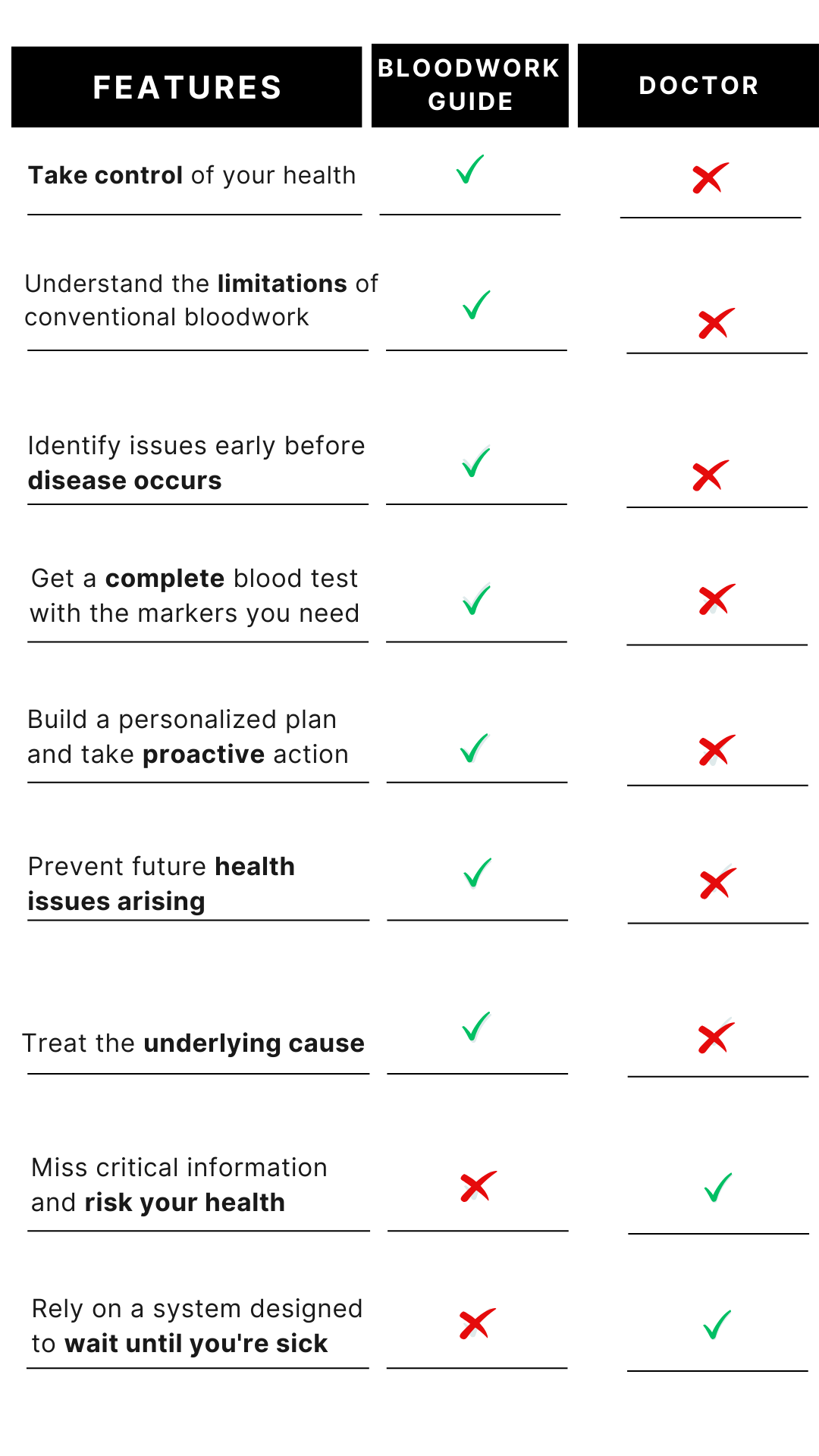 A: The Bloodwork Guide is for anyone who is experiencing health issues and is frustrated because they're not getting answers or strategies from their Doctor or Health Practitioner. The Bloodwork Guide allows you to take control of your health and take action now to overcome your health Issues rather than relying on the flawed traditional health system which is designed to wait until you develop health issues so you can be put on medication.